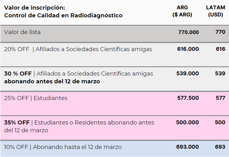 Creemos que la formación en control de calidad en radiodiagnóstico debe ser accesible, rigurosa y alineada con la realidad de la región. Por eso, articulamos con sociedades científicas y ofrecemos condiciones preferenciales para facilitar el acceso al curso.